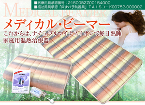 メディカルビーマーは、温熱効果で体調を整えてくれる温熱治療器です。 身体のバランス調整機能を高め、疲労を回復します。 メディカルビーマーは、エレクトレット繊維ジェエル・ビーム・ファイバーを使用することで、身体を整えます。ジュエル・ビーム・ファイバーは、ナチュラルマイナスイオンを発生させるトルマリン(電気石)の鉱石を微粒に粉砕し、繊維1本1本に練り込んだ特殊繊維です。 疲労回復、血行を良くする、筋肉の疲れを取る、筋肉のコリをほぐす、神経痛・筋肉痛の緩和、胃腸の働きを活発にする、などの効果が期待出来ます。 温熱効果で血行が良くなり、身体も温まって疲労の回復を図ります。 頭寒足熱で足腰の冷えを和らげ、寝つきが良くなり、爽やかな目覚めを迎えることができます。